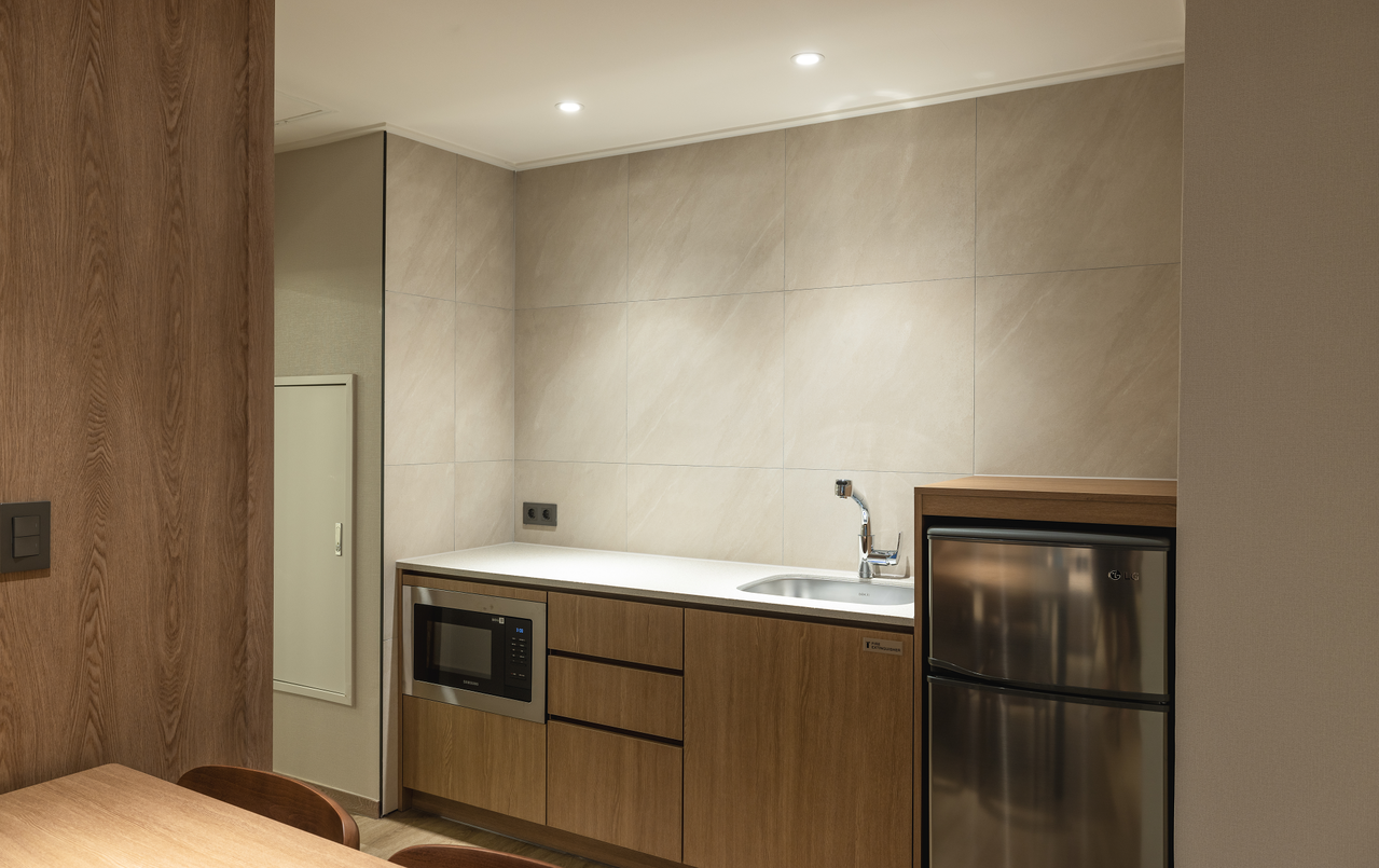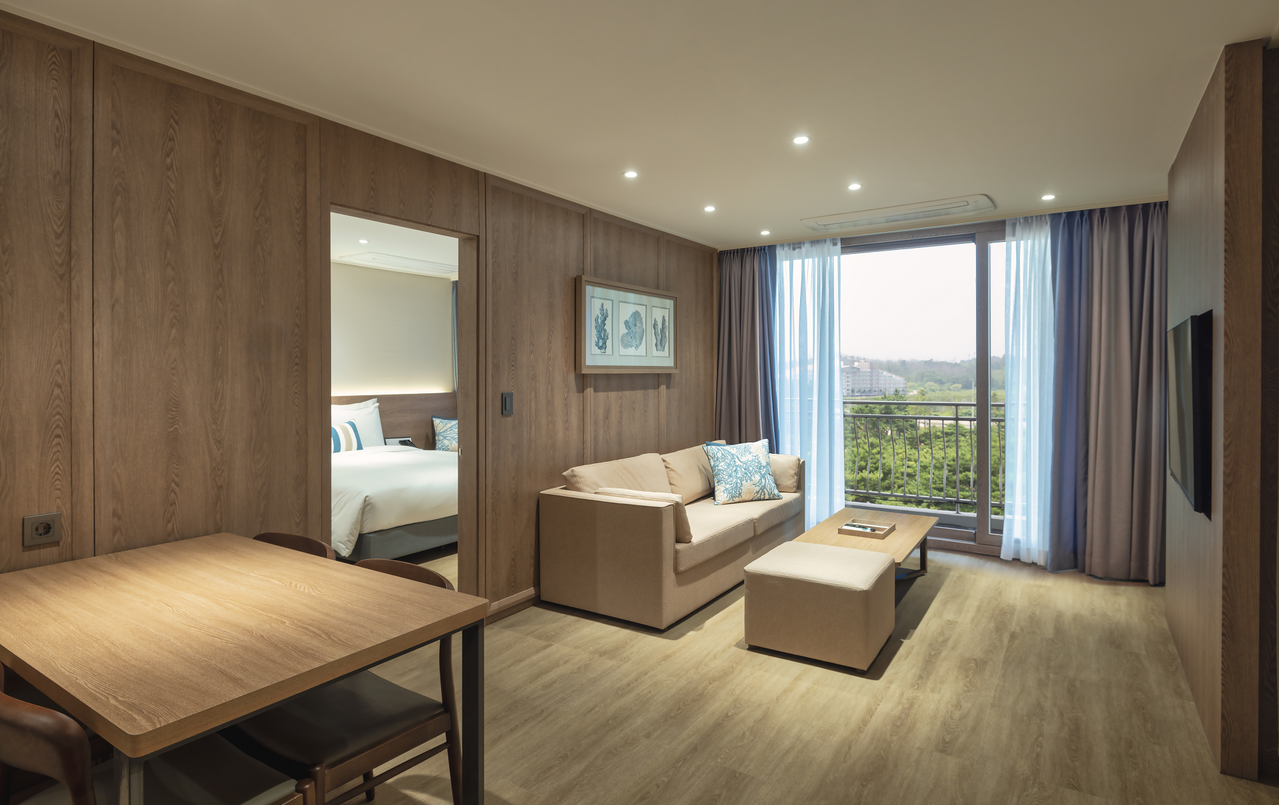 (리뉴얼/미취사) 창문 너머 동해의 푸르른 바다가 펼쳐지며 마린 느낌이 물씬 풍기는 거실1 + 방1 + 욕실1의 형태로 바 테이블 위에서 바다 전망을 바라보며 커피 한 잔의 여유를 즐길 수 있는 객실 (취사가 제한된 클린룸 형태)