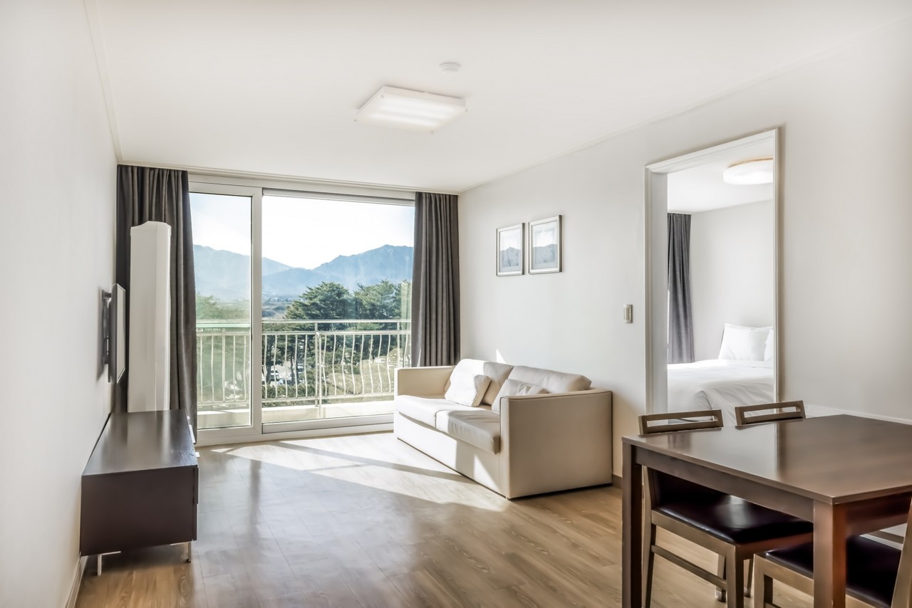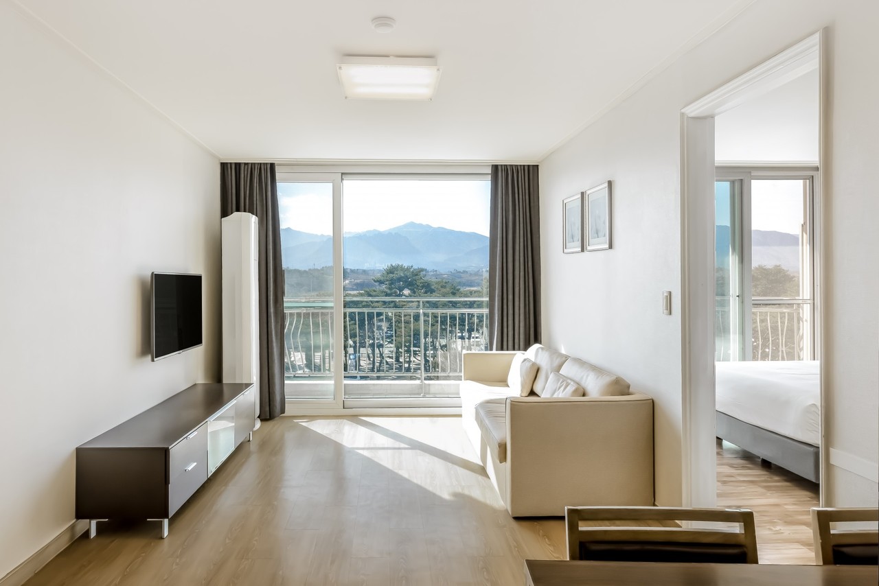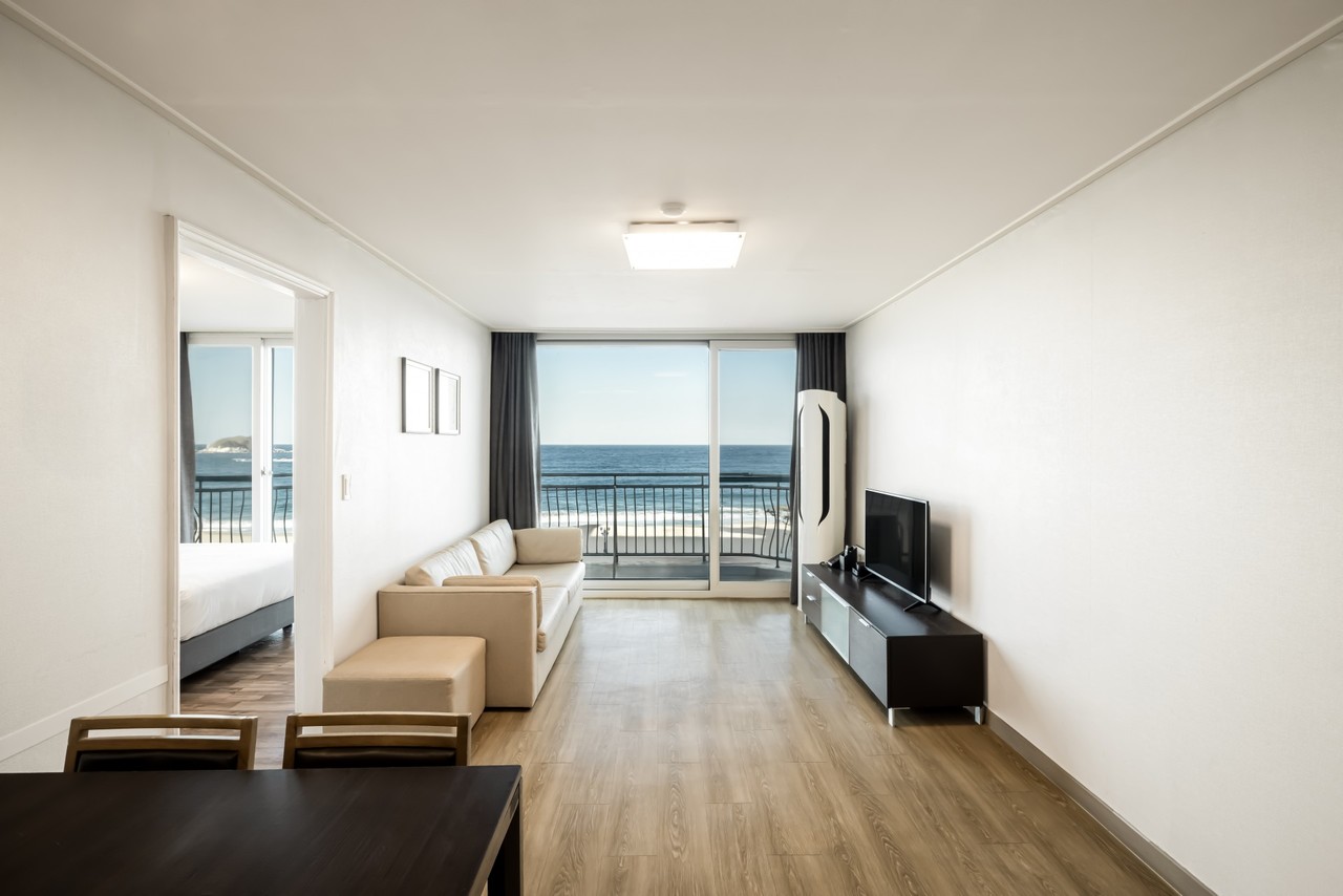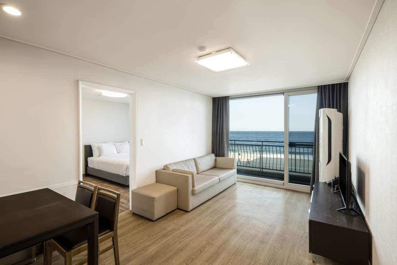 (비리뉴얼/취사가능) 창문을 열면 동해의 푸르른 바다가 펼쳐지고 테라스에서 일출을 감상할 수 있는 거실1+방1+욕실1 형태의 객실