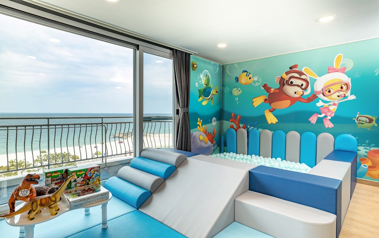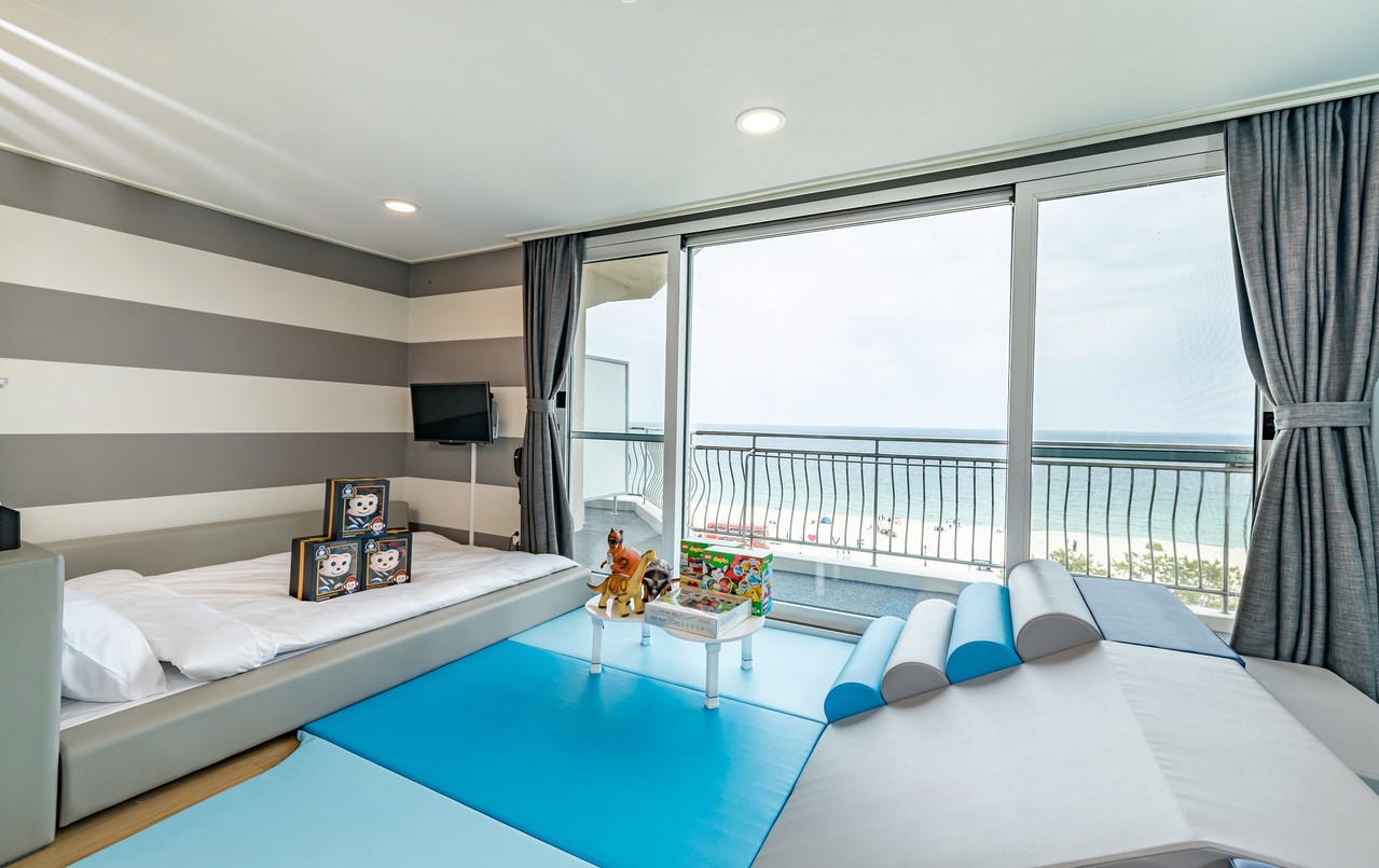 (리뉴얼/미취사) 창문 너머 동해의 푸른 바다가 펼쳐지고 객실에서 아이들이 즐길 수 있는 원룸 형태의 프라이빗 키즈플레이존 객실